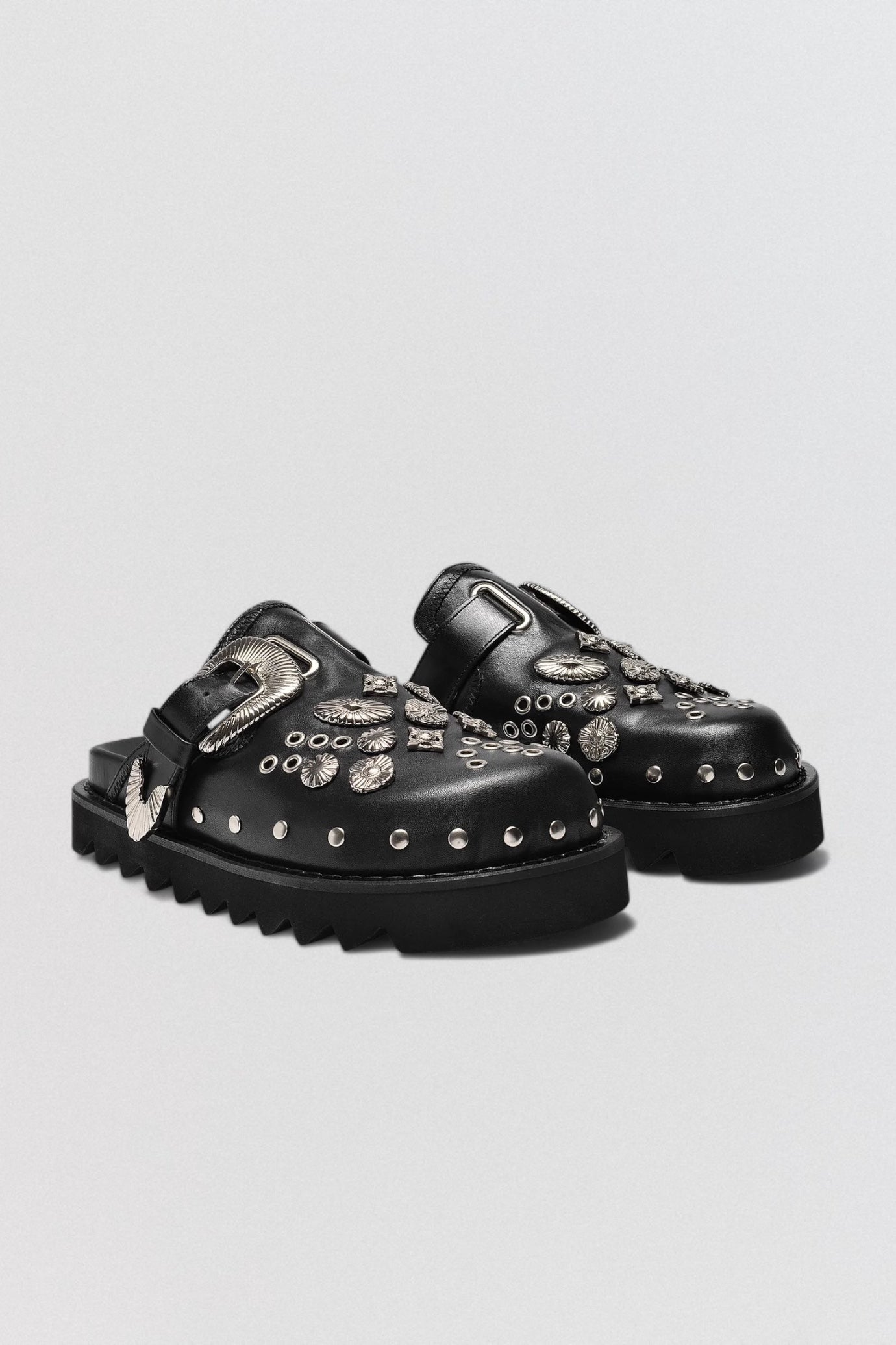 The Toga AJ1066 in Black Leather is a fearless fusion of clog and sandal, designed with bold expression for modern men. Crafted from premium leather, this hybrid silhouette features a closed toe, open heel, and rugged outsole. Embellished with Western-style silver studs, grommets, and an engraved buckle, the AJ1066 delivers character in every step. Built for impact, built for comfort—this is standout footwear for those who refuse to blend in. Available exclusively at LABOUTIK Bali, the island’s only curated designer fashion destination.