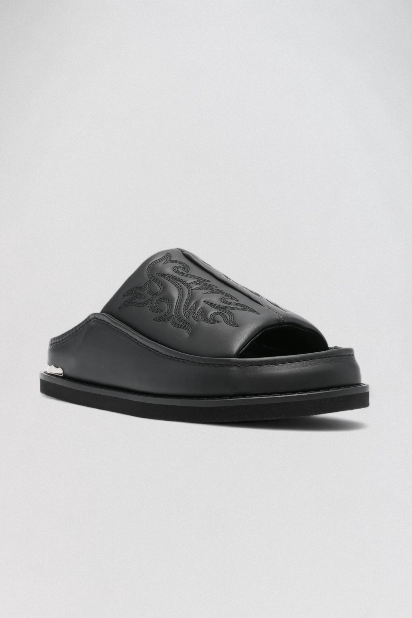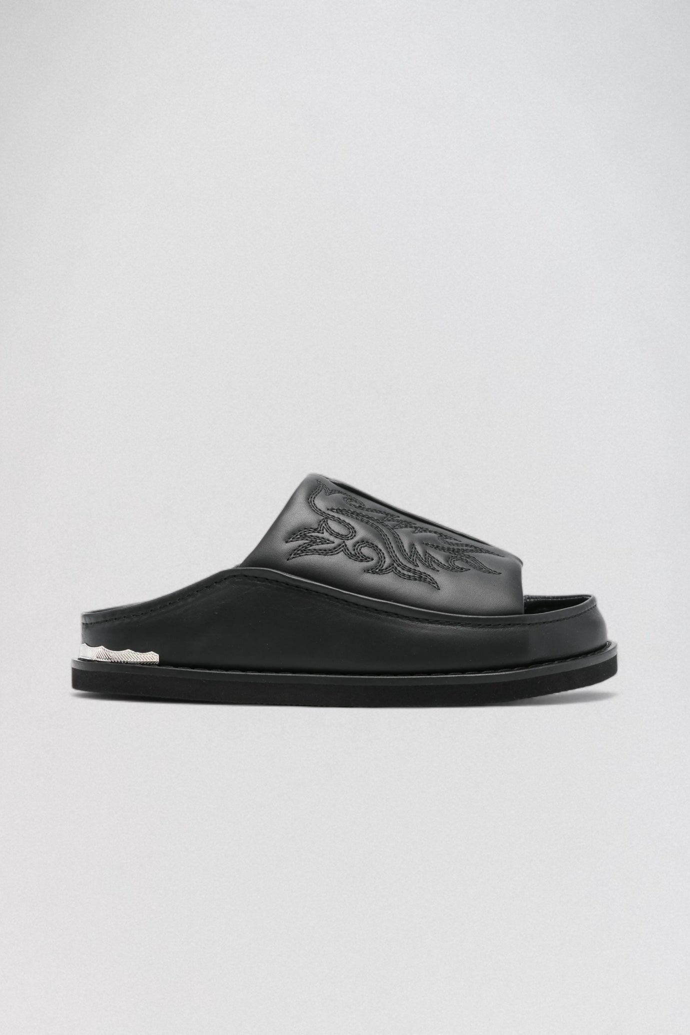 The Toga AJ1388 Black Leather Slide is a sleek statement of subtle rebellion. Designed for men, this sandal is crafted from smooth black leather and features tonal flame embroidery across the wide front strap—channeling quiet edge with every step. The molded footbed offers comfort, while a sculpted heel with silver hardware adds a refined finish. Effortlessly modern and undeniably Toga, this slide pairs equally well with tailored looks or casual fits. Available exclusively at LABOUTIK Bali—your only curated destination for designer fashion on the island.