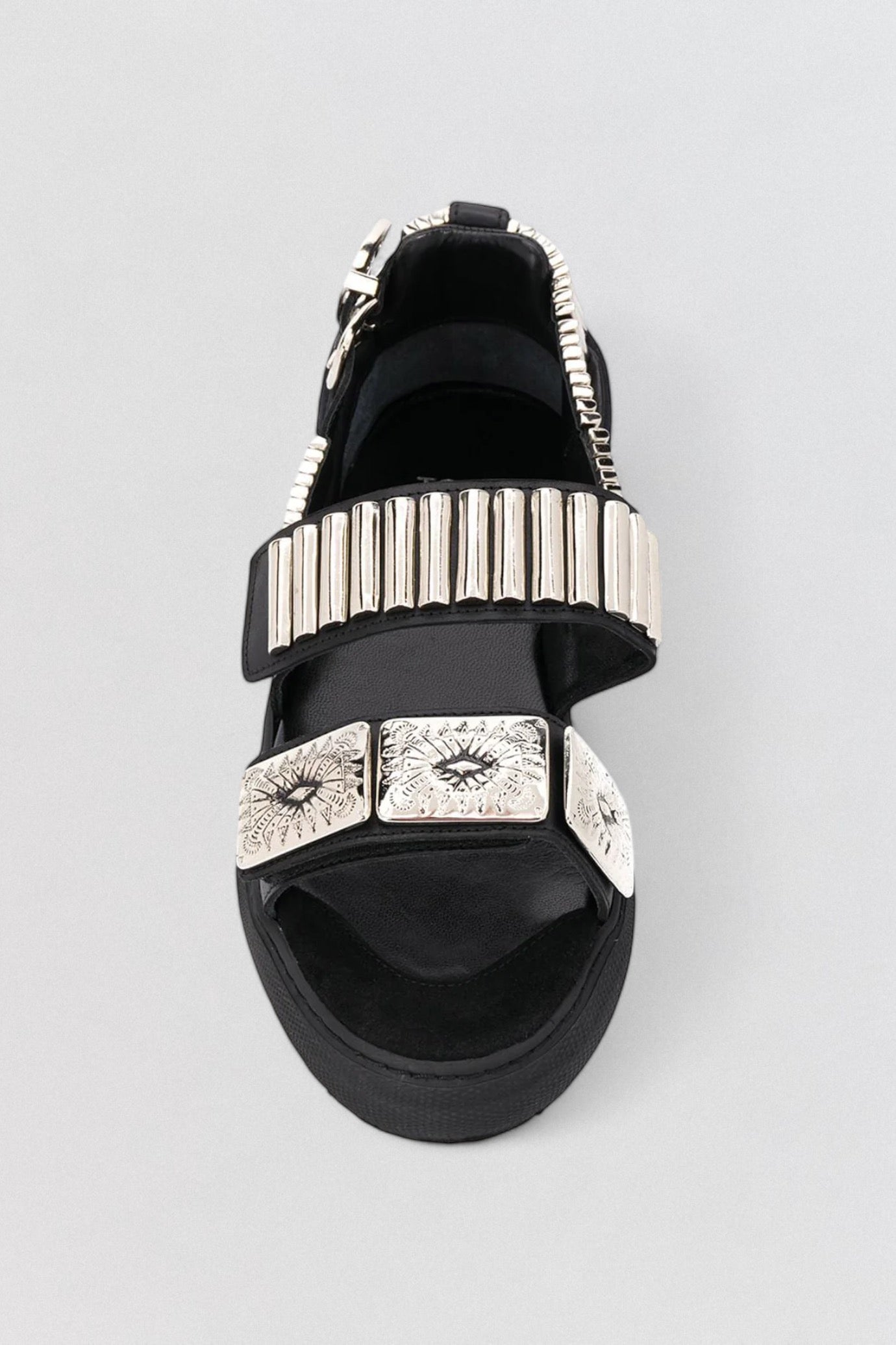 These sandals feature a sleek metal strap and an adjustable leather strap for a customizable fit. The innovative sneaker sole not only offers a stylish look but also provides cushioning for added comfort. Perfect for those seeking both practicality and contemporary style.