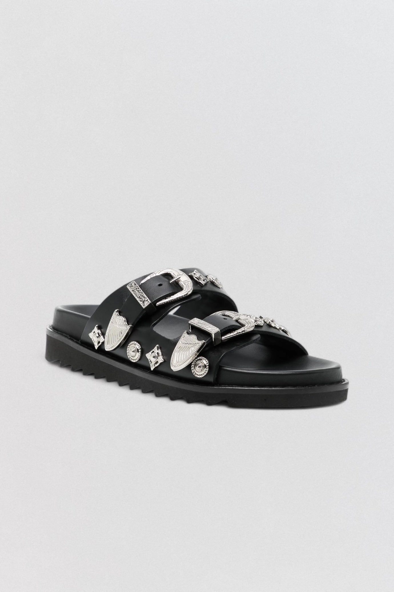 The Toga AJ830 in Black Leather delivers a masculine take on the iconic Western slide. Crafted for men, this sandal features wide leather straps accented with engraved silver buckles and signature studded hardware—bringing Toga’s bold detailing to a classic silhouette. A molded footbed ensures comfort, while the jagged sole adds traction and edge. This is statement footwear built for both presence and practicality. Available exclusively at LABOUTIK Bali—your go-to for curated designer menswear.