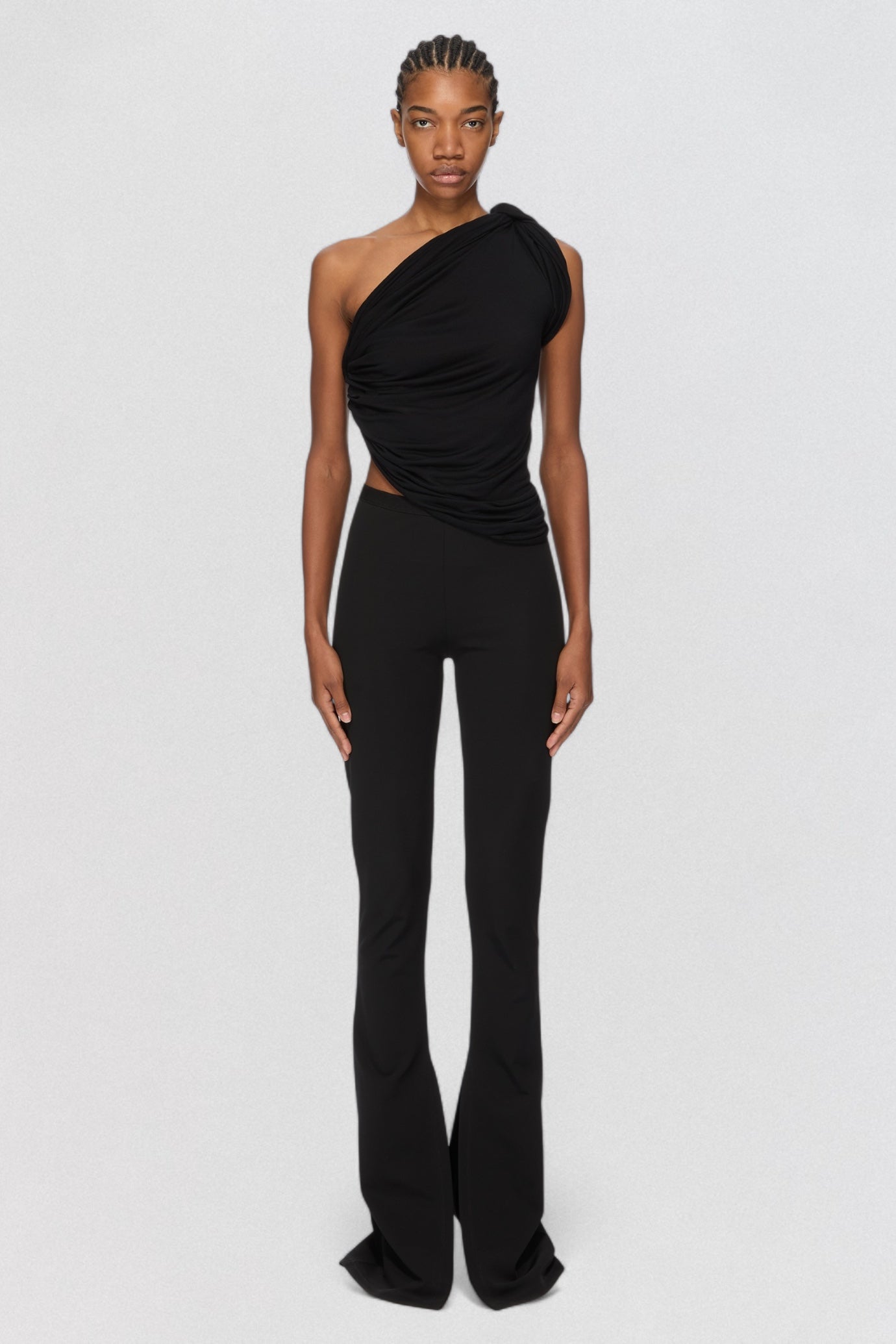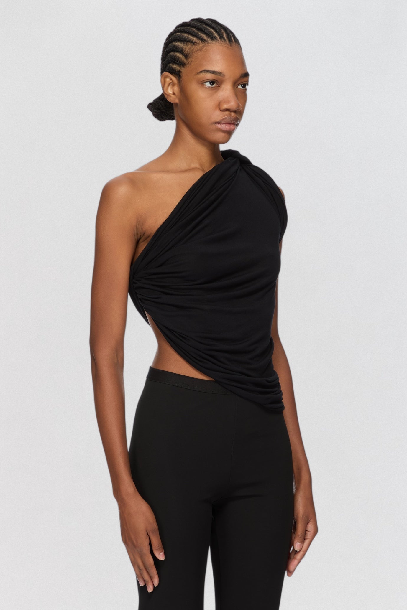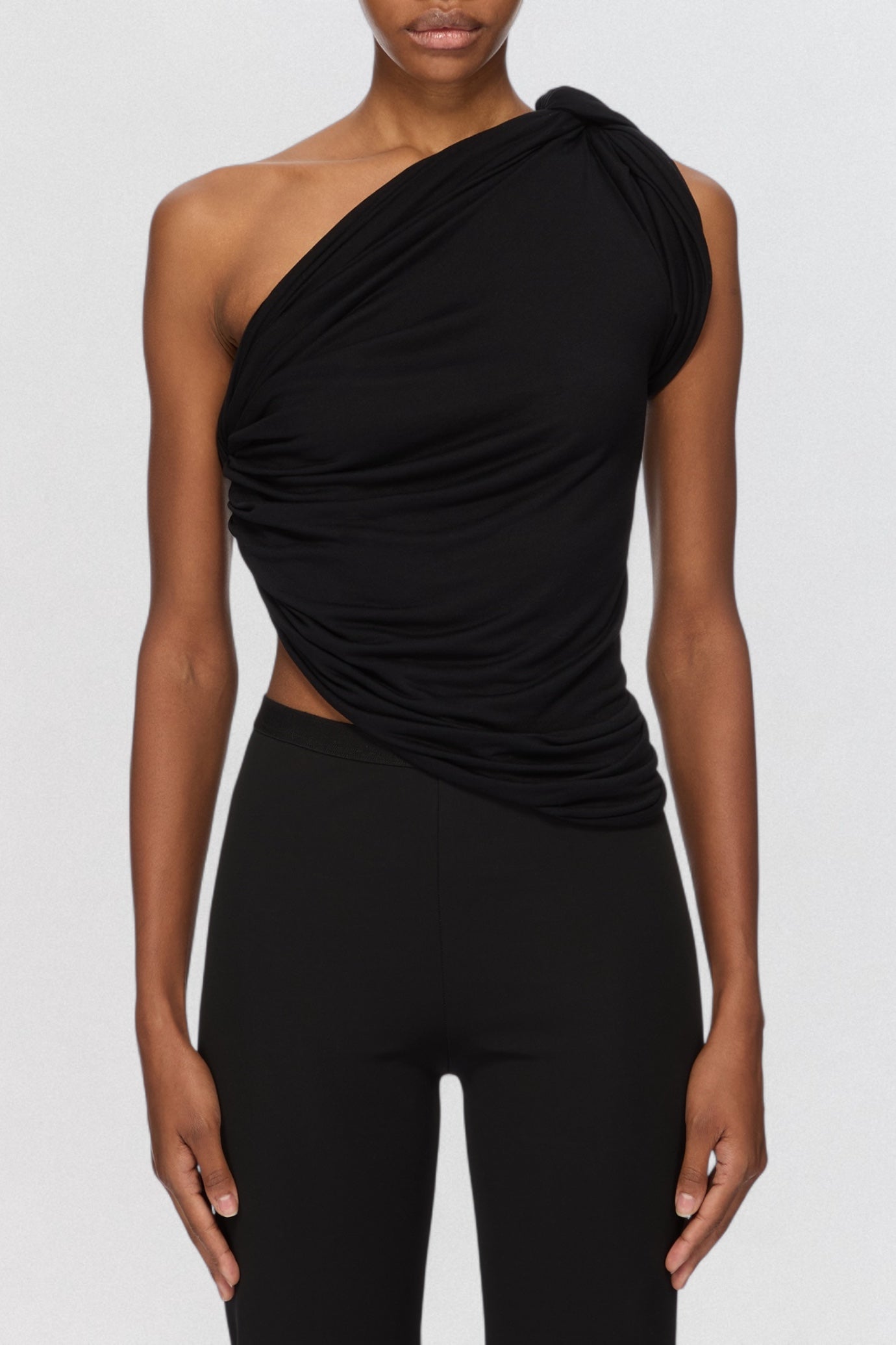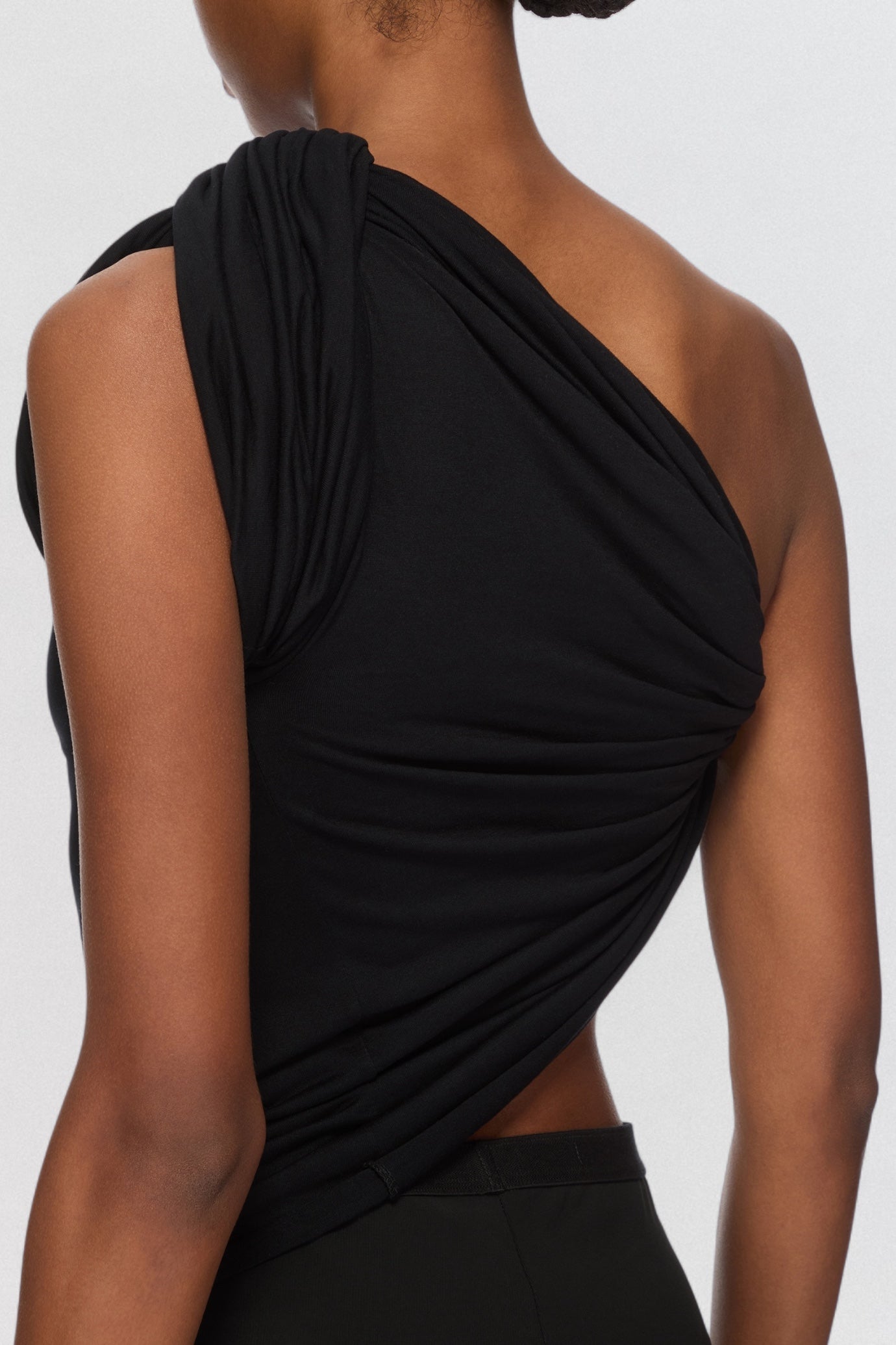 - Fit: Fitted with a draped, asymmetric one-shoulder neckline.