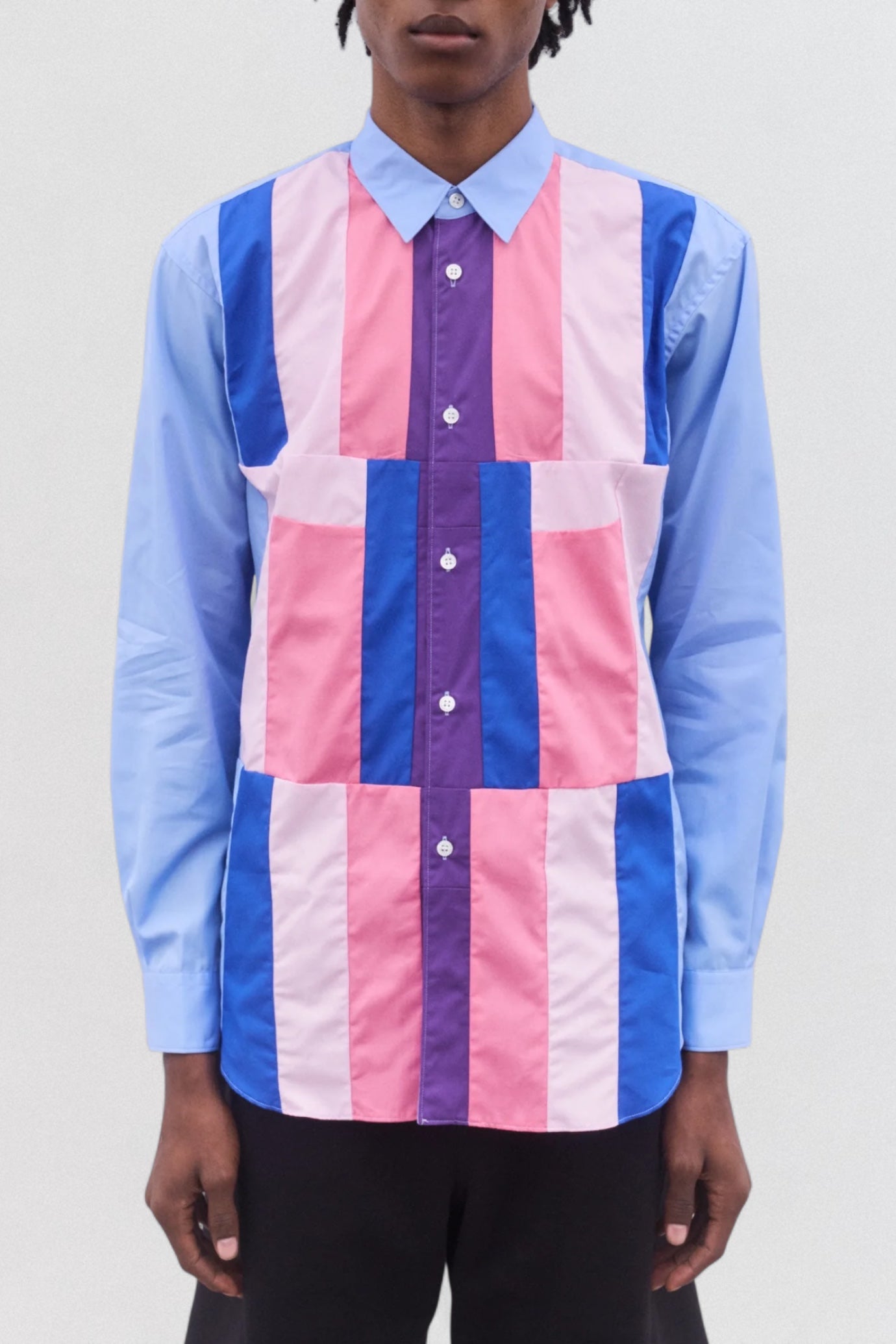 The Comme des Garçons SHIRT Colourblock Panel Shirt reimagines the classic button-up with bold geometric panelling in contrasting tones of pink, purple, and blue. Expertly crafted in cotton, this long-sleeve shirt balances playful design with sharp tailoring, featuring a point collar, button placket, and curved hem. A chest pocket adds functionality, while the colourblock composition creates a statement piece that embodies the brand’s avant-garde aesthetic. Perfect for layering or as a standout solo piece, this shirt highlights CDG’s innovative approach to everyday menswear.