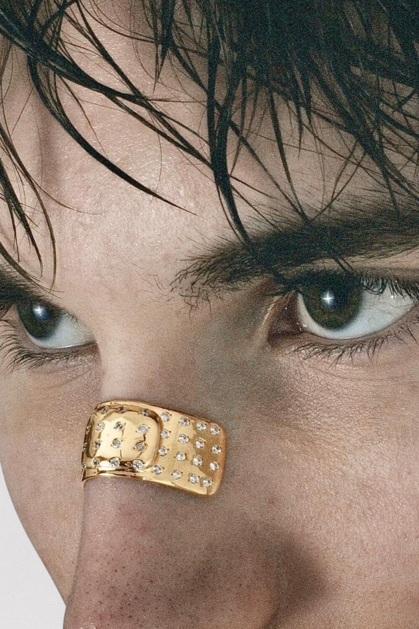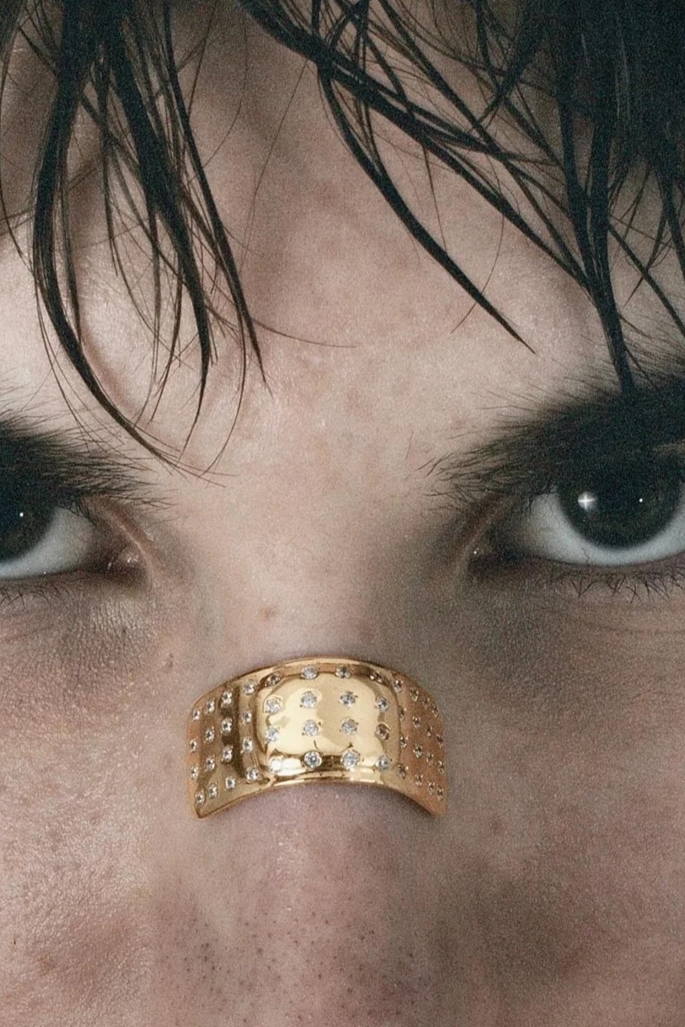 A subversive take on facial adornment, Alan Crocetti’s Encrusted Mini Nose Plaster is crafted from 925 sterling silver and fully encrusted with clear crystal zirconias. This statement piece reimagines the bandage aesthetic into something strikingly glamorous. Worn on the bridge of the nose and secured with eyelash glue, it fuses fine jewelry with rebellious attitude — a bold detail for editorial styling or avant-garde everyday wear.