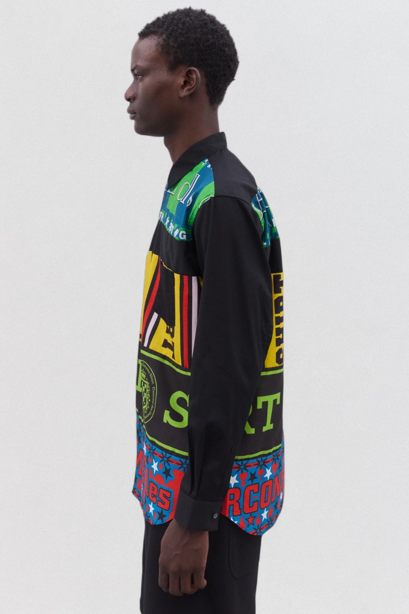The Comme des Garçons SHIRT Football Scarf Shirt reimagines the button-up with bold graphic energy inspired by vintage football scarf prints. Crafted from premium cotton, this long-sleeve shirt features a sharp point collar, button placket, curved hem, and a chest patch pocket. The vibrant collage of stripes, crests, stars, and slogans transforms a wardrobe classic into a statement piece, reflecting Comme des Garçons’ playful take on sports and street style. Perfect for layering or wearing solo, it adds standout character to any look.