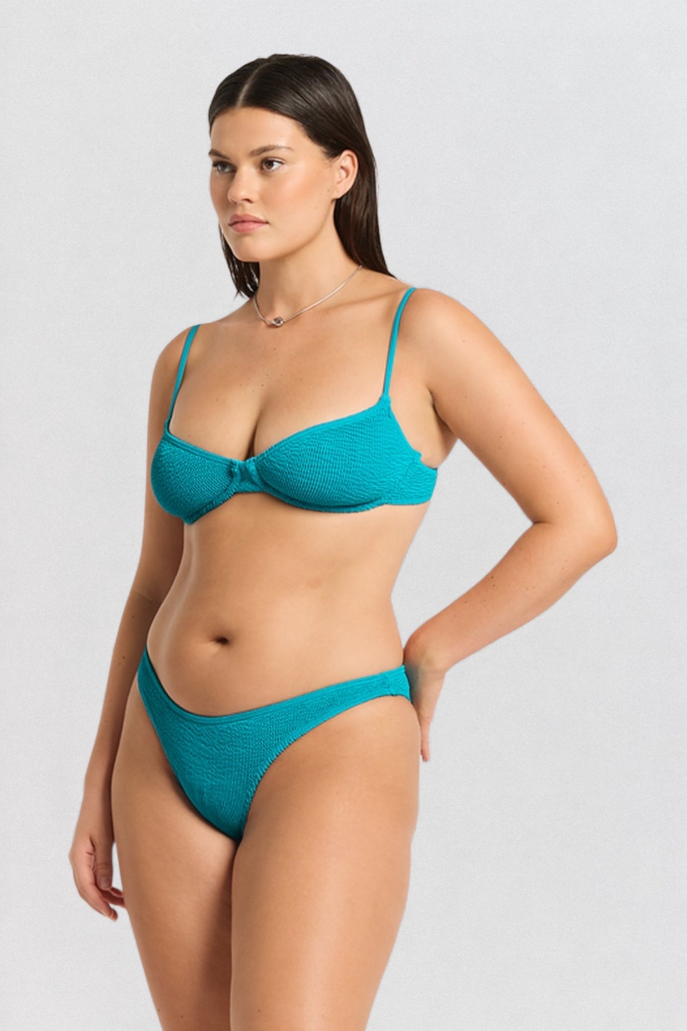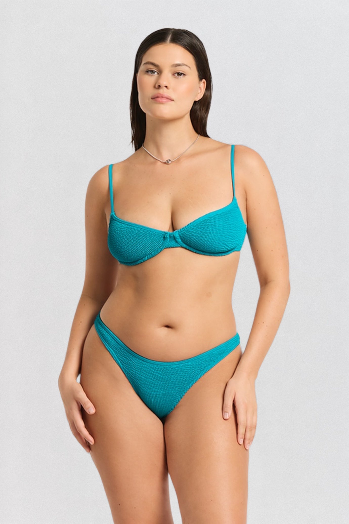The Gracie Balconette is Bond-Eye’s latest innovation in supportive swimwear, reimagining the classic balconette silhouette through the brand’s signature unsized crinkle technology. Crafted from The Authentic Crinkle™, this is the first-ever unsized crinkle balconette top to feature a flexible underwire, delivering structure without compromising comfort.