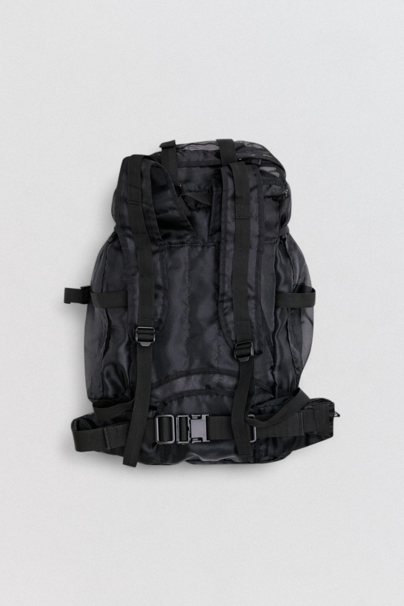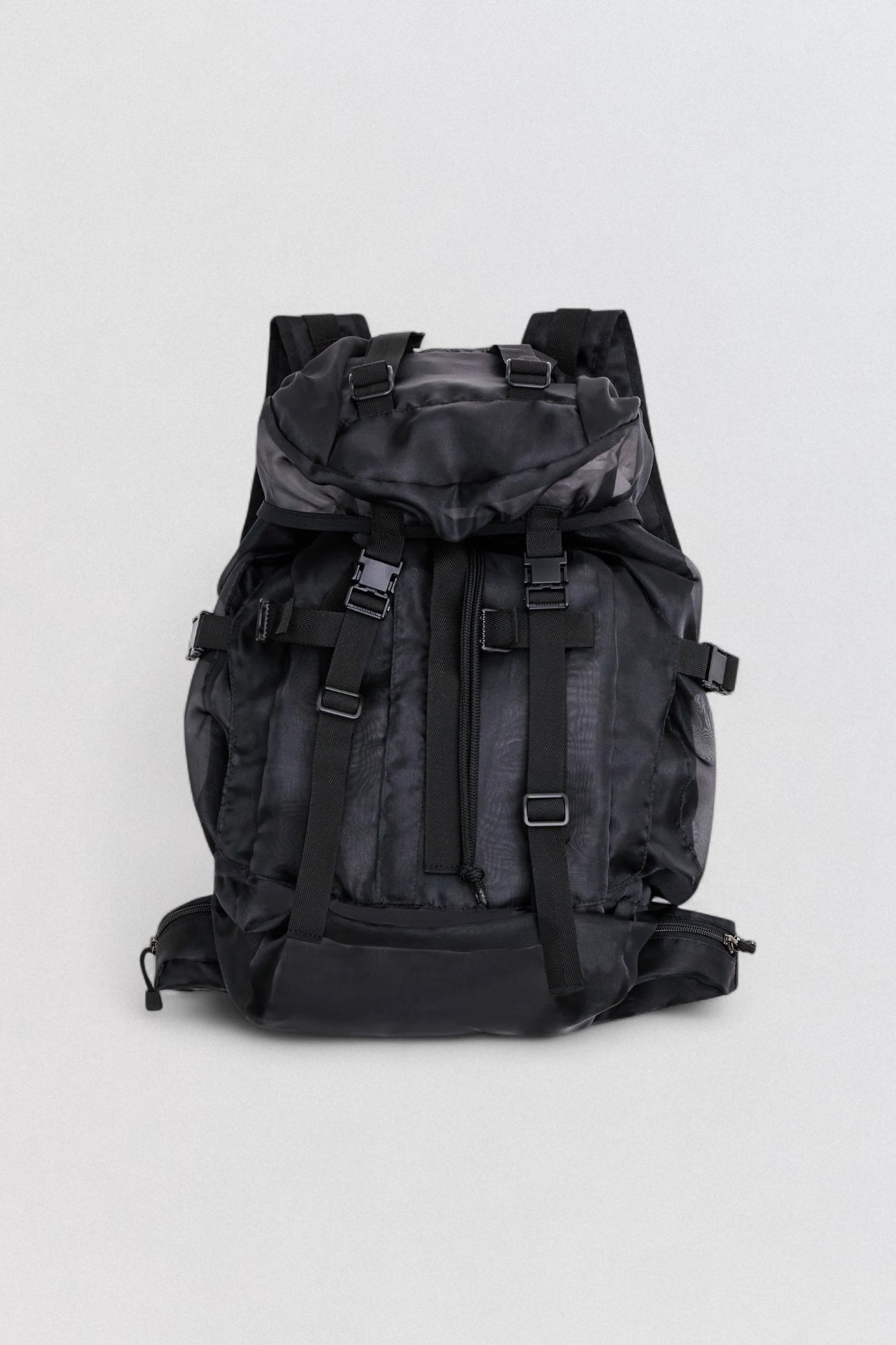 This technical backpack merges utilitarian function with a fashion-forward silhouette. Crafted in a semi-sheer nylon for a distinct urban edge, it features multiple zip pockets, buckle closures, and fully adjustable webbing straps across the front, back, and sides. A cushioned shoulder system ensures comfort during wear, while the waist strap provides added stability. Designed with both structure and flexibility in mind, this piece is equal parts gear and garment—ideal for styling over outerwear or worn solo as an architectural statement. Whether you’re navigating city terrain or elevating your streetwear layers, this backpack offers elevated functionality and directional styling in one.