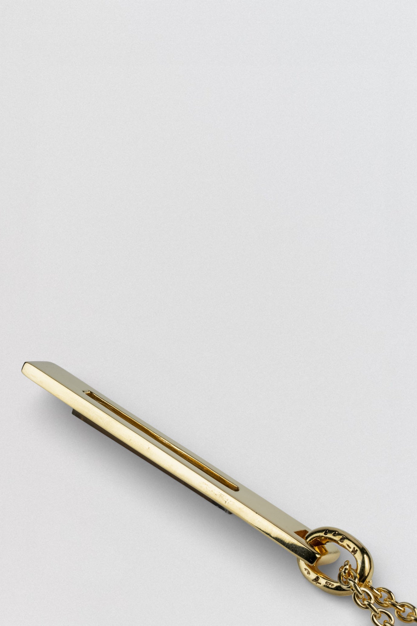 The Plate Necklace is a study in contrast — rigid geometry paired with raw translucence. A gold-plated sterling silver plate anchors the piece, extending into a clear crystal jacket that reveals the material’s natural structure and light-catching irregularities.