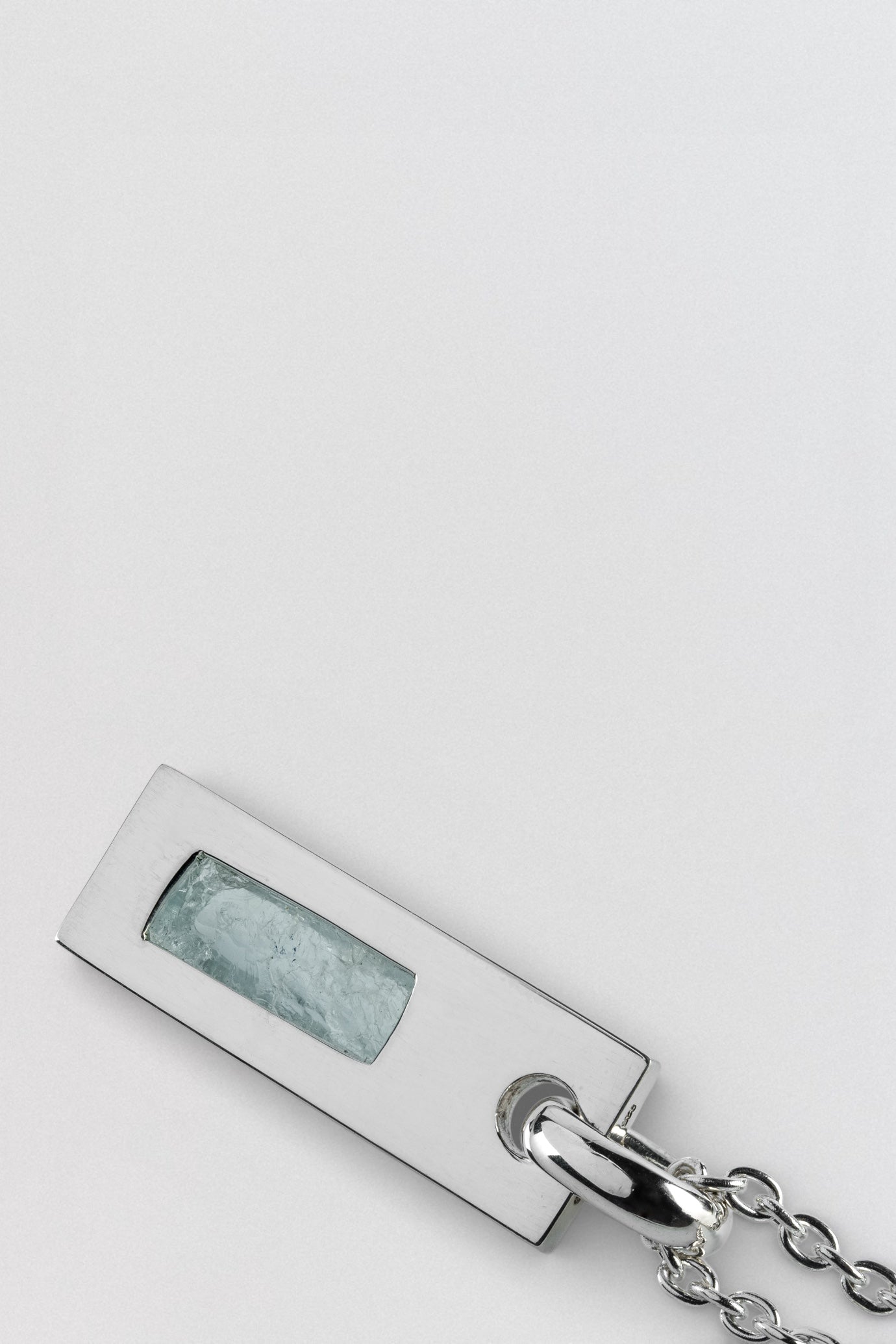 The Plate Necklace refines Parts of Four’s material language into a lighter, more compact composition. Crafted in polished sterling silver, the vertical plate pendant frames a blue aquamarine crystal, partially encased in a crystal jacket that protects while revealing the stone’s natural clarity and hue.