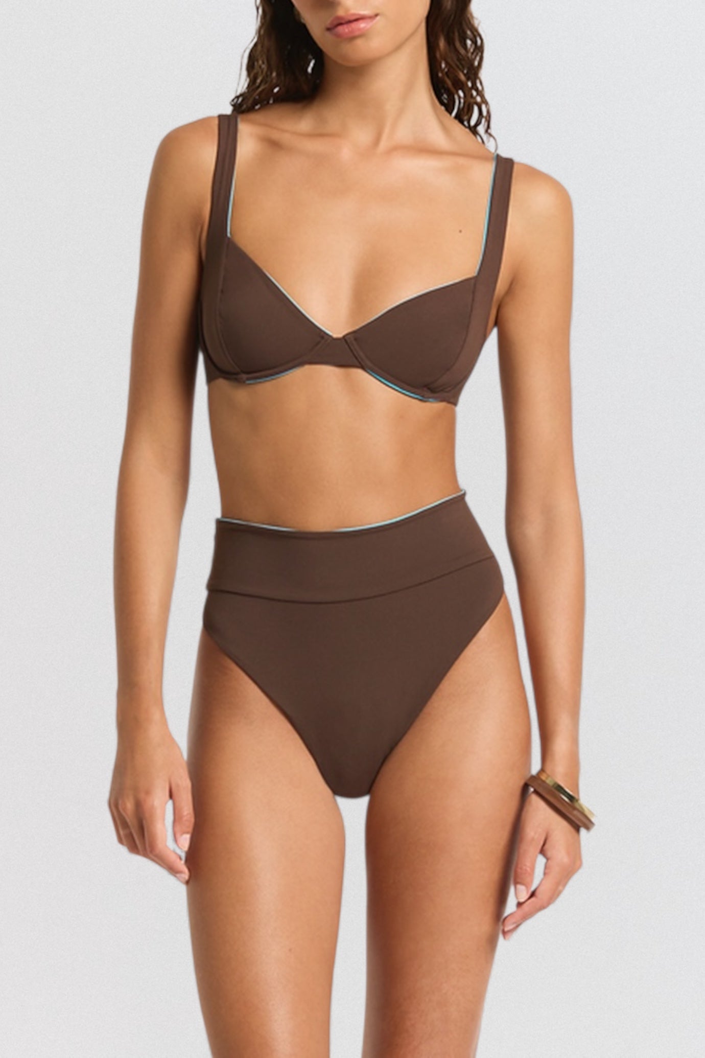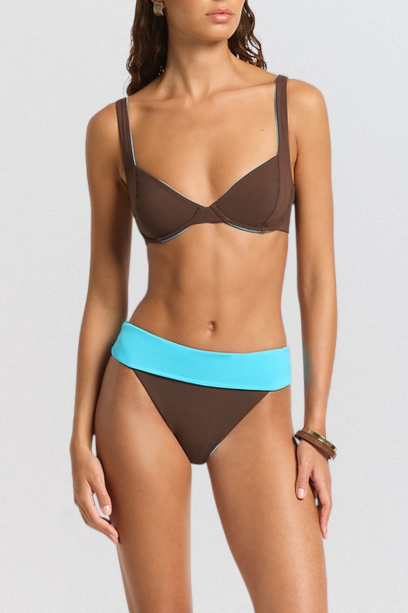 The fold-over waistband allows for multi-wear styling: choose a sleek mid-rise look or fold it high for a high-waisted, elongated silhouette. With its reversible construction, the Raya Brief switches seamlessly between Espresso and Cala, giving you two looks in one minimal, refined design.