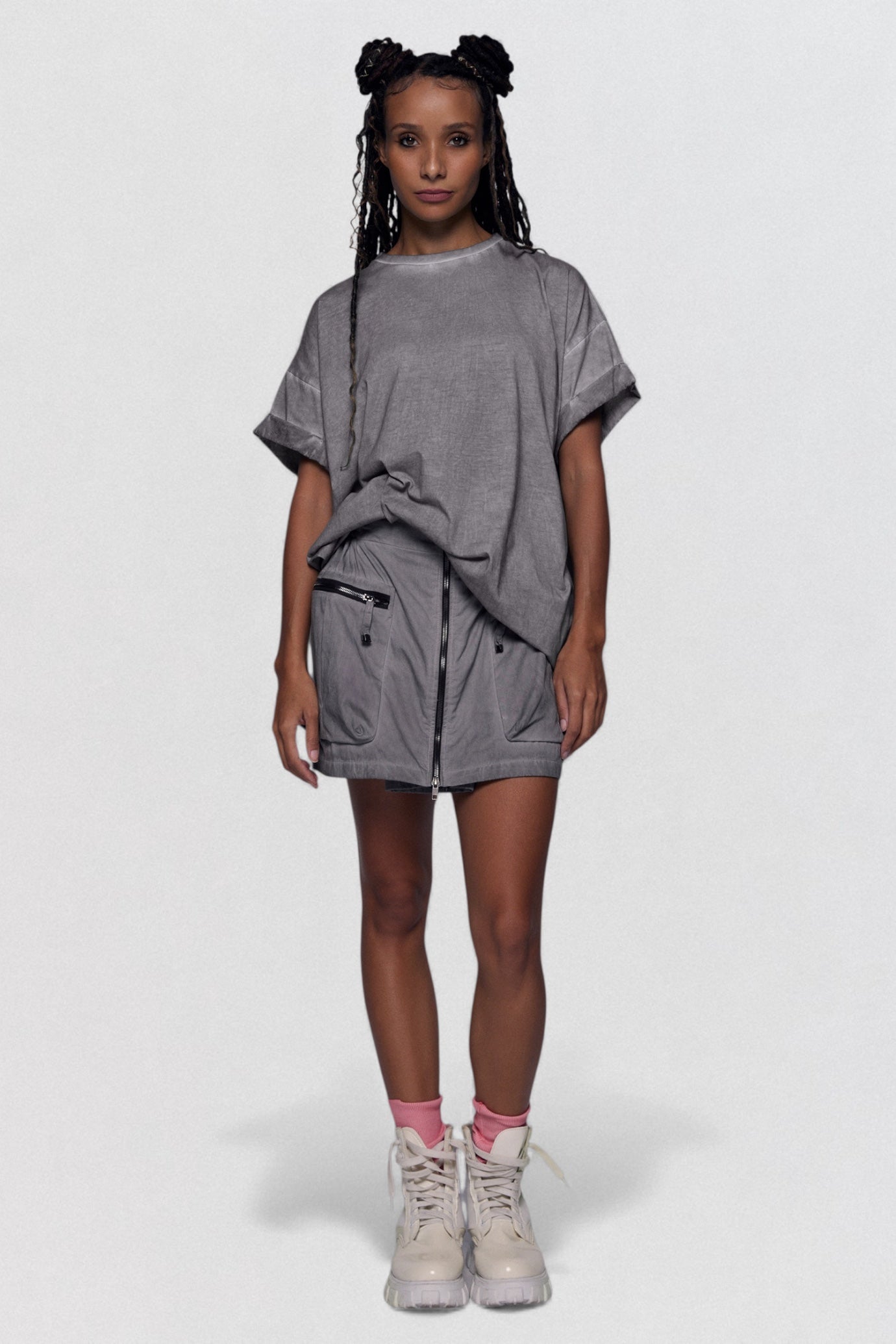 The Desu “Rhinestone T-Shirt” reinterprets casual streetwear through a refined, industrial lens. Crafted from washed grey cotton, this oversized tee features a boxy silhouette and a distressed finish for a lived-in, tactile appeal. The highlight lies on the back — a striking rhinestone spine motif that adds a sculptural, light-catching dimension to its minimalist construction.