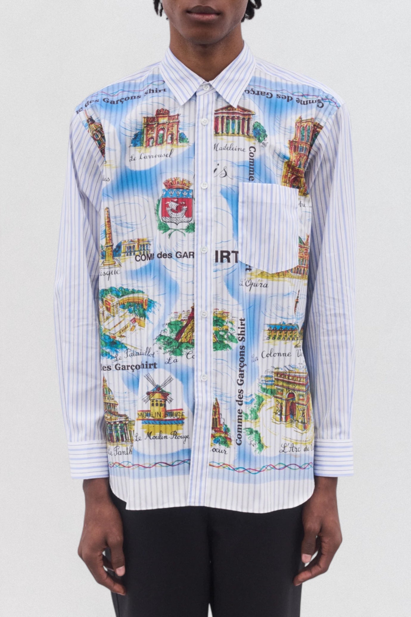 The Comme des Garçons SHIRT Striped Landmark Shirt from the AW25 collection combines refined tailoring with playful artistry. Crafted in crisp cotton with a blue pinstripe base, this long-sleeve shirt is adorned with illustrated Parisian landmarks, including the Eiffel Tower, Arc de Triomphe, and Moulin Rouge, giving it a statement-making edge. Designed with a point collar, curved hem, chest pocket, and classic button placket, it blends everyday sophistication with bold graphic storytelling. A standout piece for those who appreciate Comme des Garçons’ unique balance of tradition and disruption.