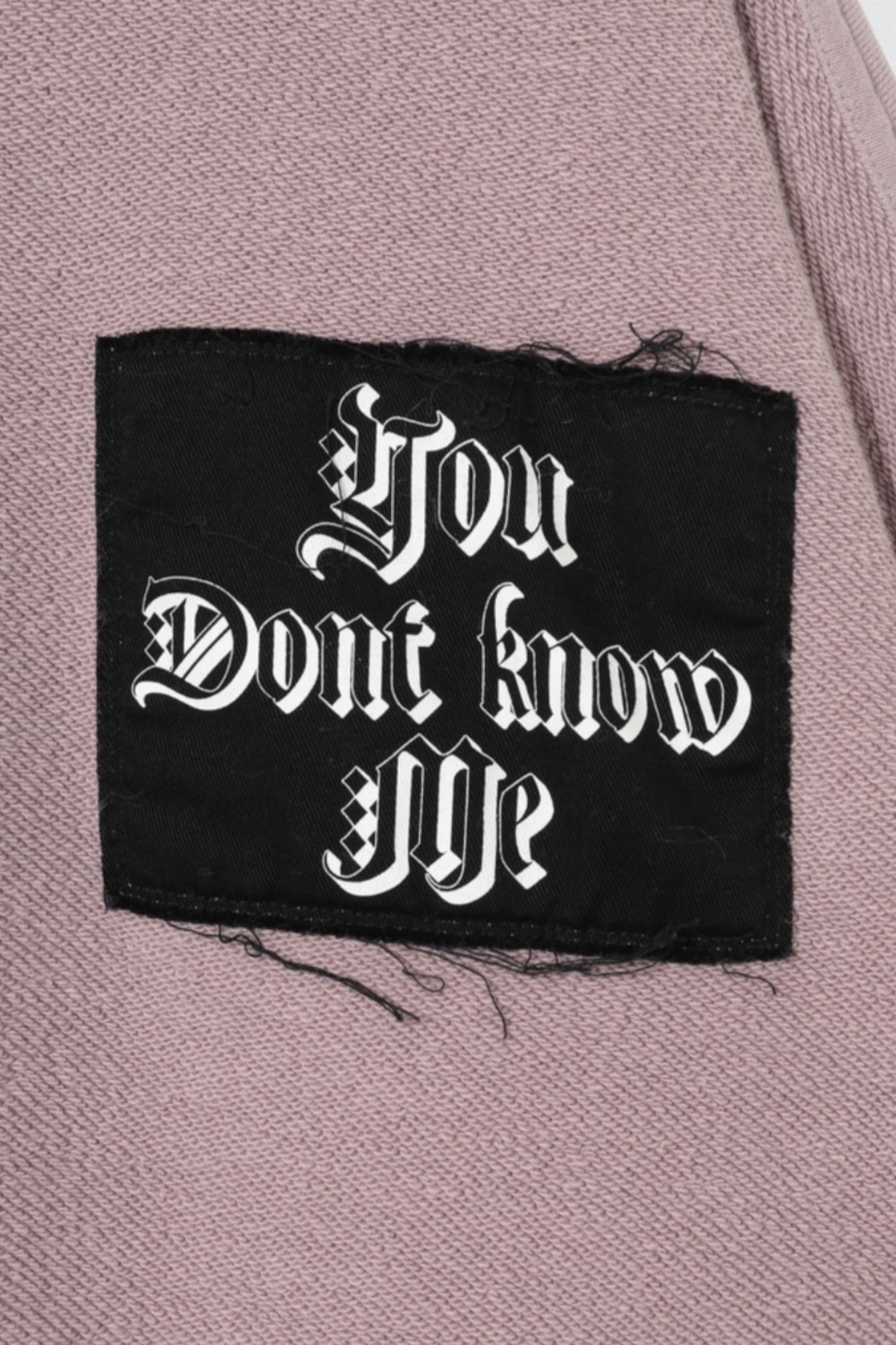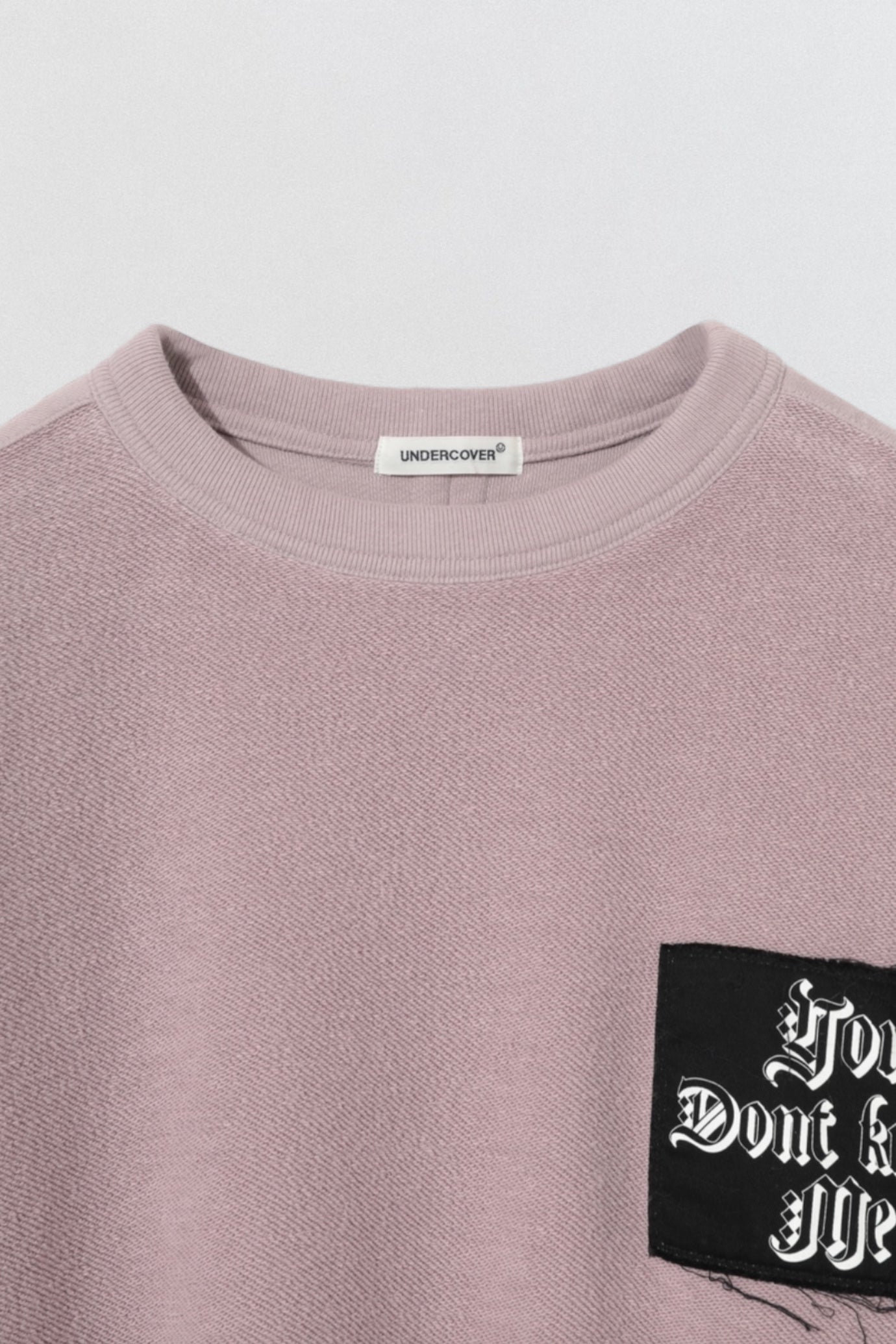 The Undercover “You Don’t Know Me” Sweatshirt blends streetwear attitude with premium craftsmanship. Made from soft, high-quality cotton in a muted mauve tone, this relaxed-fit sweatshirt features dropped shoulders, ribbed trims, and a raw-edged black patch on the chest embroidered with the bold statement “You Don’t Know Me” in gothic script. Exposed seam details at the back and sleeves add a deconstructed edge, while the brushed interior ensures all-day comfort.