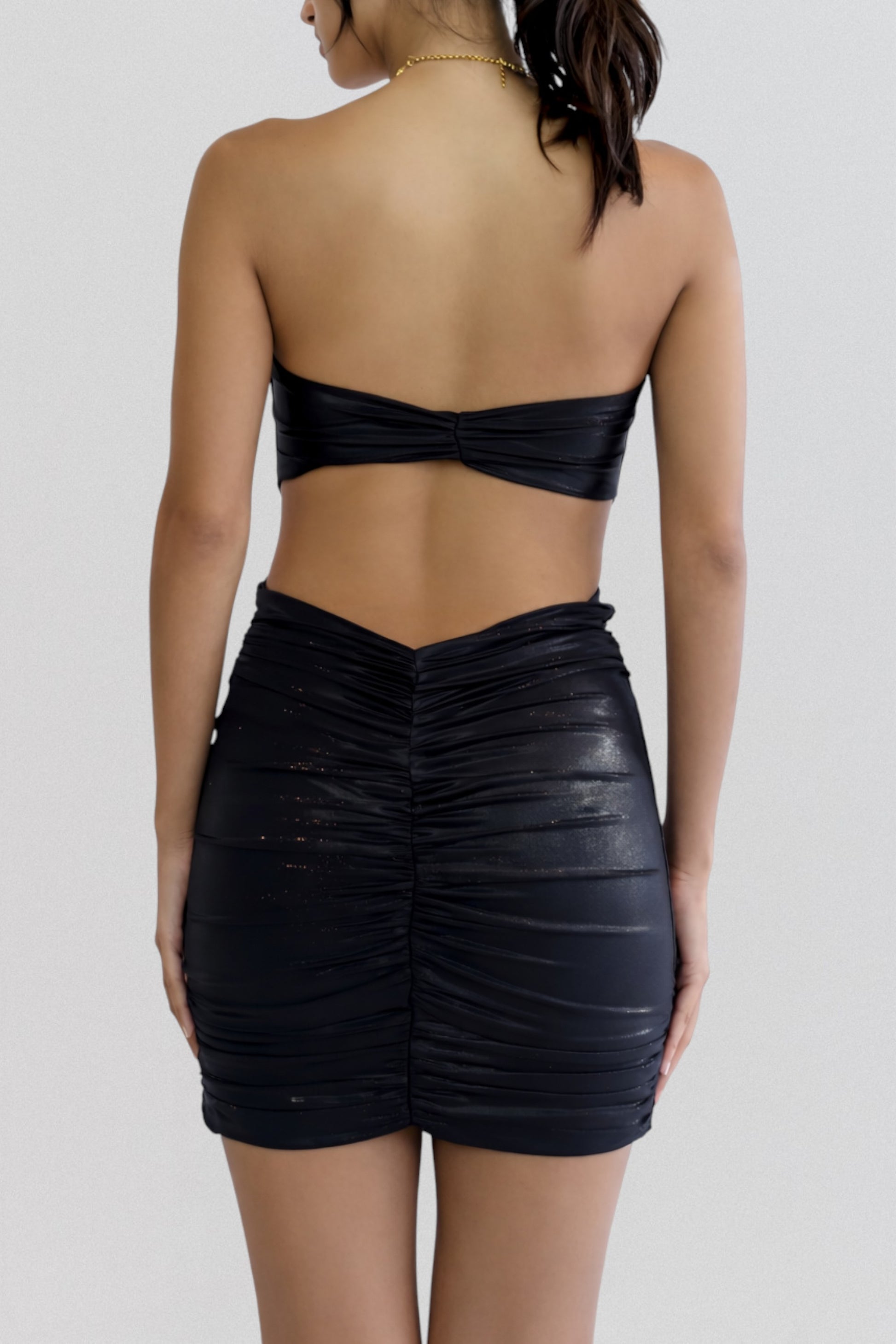 A sculptural expression of seduction and strength, the Temptress Mini Dress by Di Petsa is designed to contour the body like liquid metal. Crafted from metallic-coated jersey, the silhouette features strategic cut-outs connected by woven gold-tone chains, creating a bold interplay between skin, movement, and form. Fully lined for comfort, this piece balances sensuality with precision tailoring — unmistakably Di Petsa.