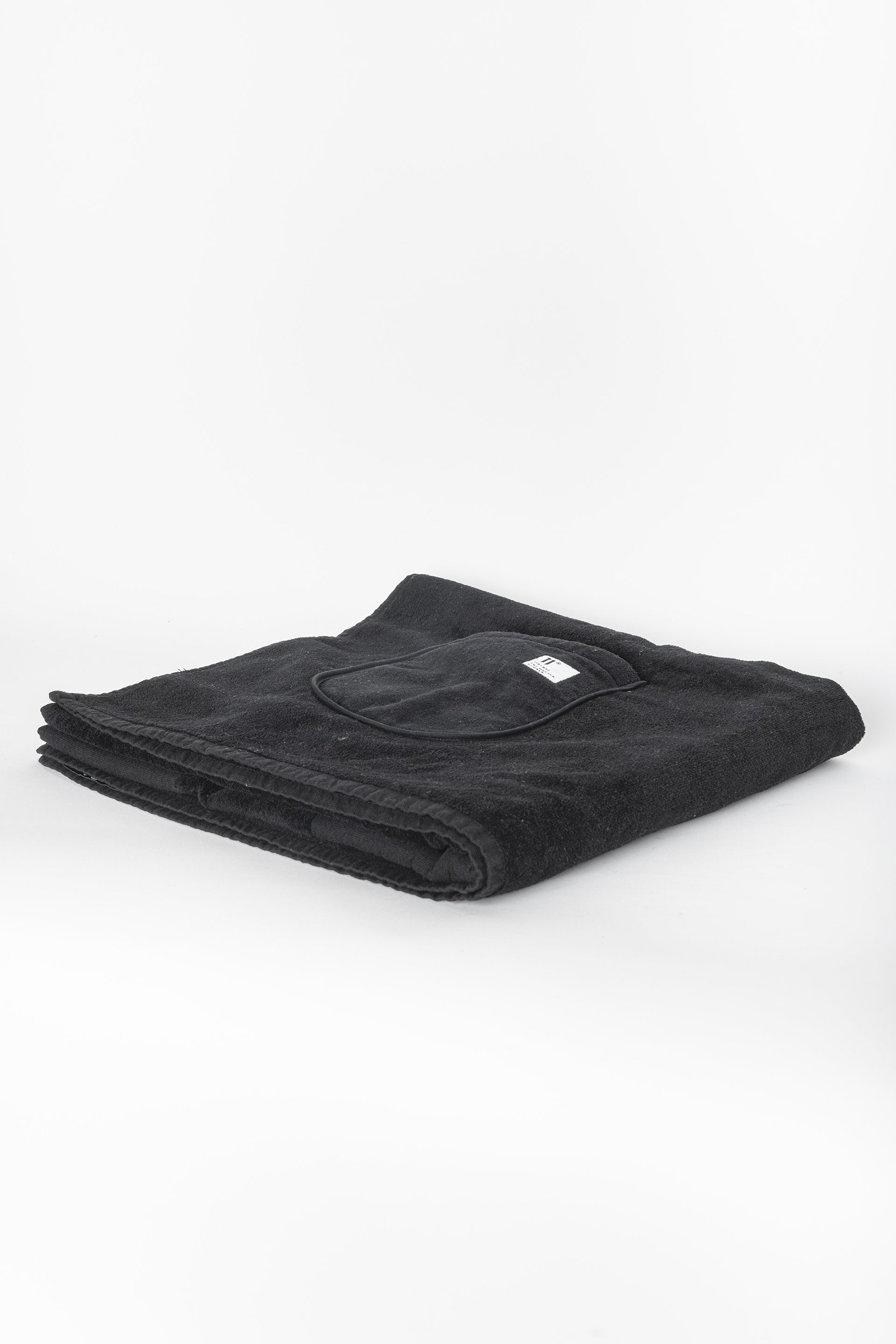 Black cotton patch pocket towel from 11 By Boris Bidjan Saberi permanent collection featuring a front logo pocket and a rectangular body.