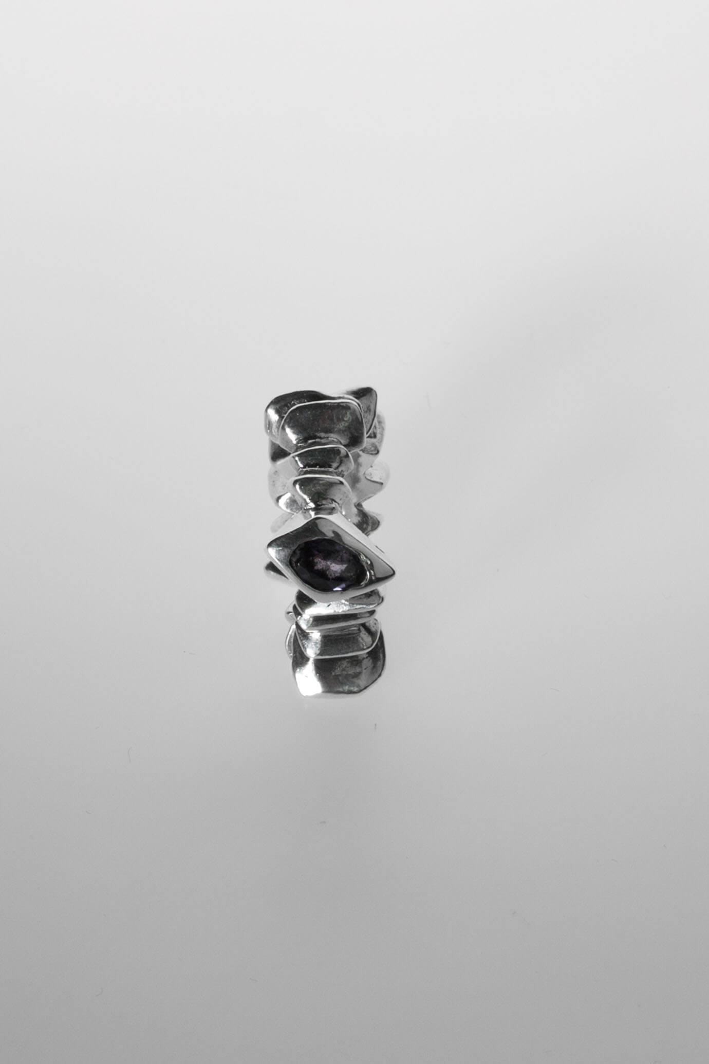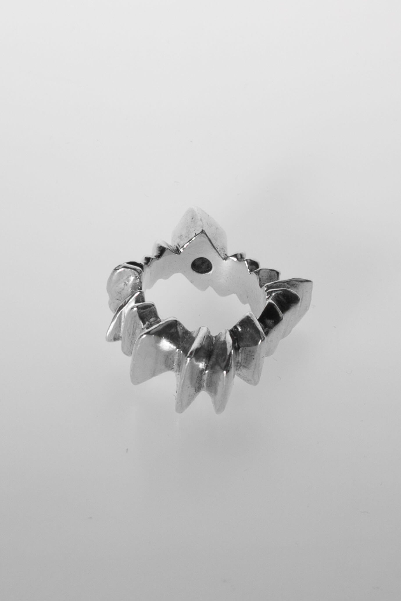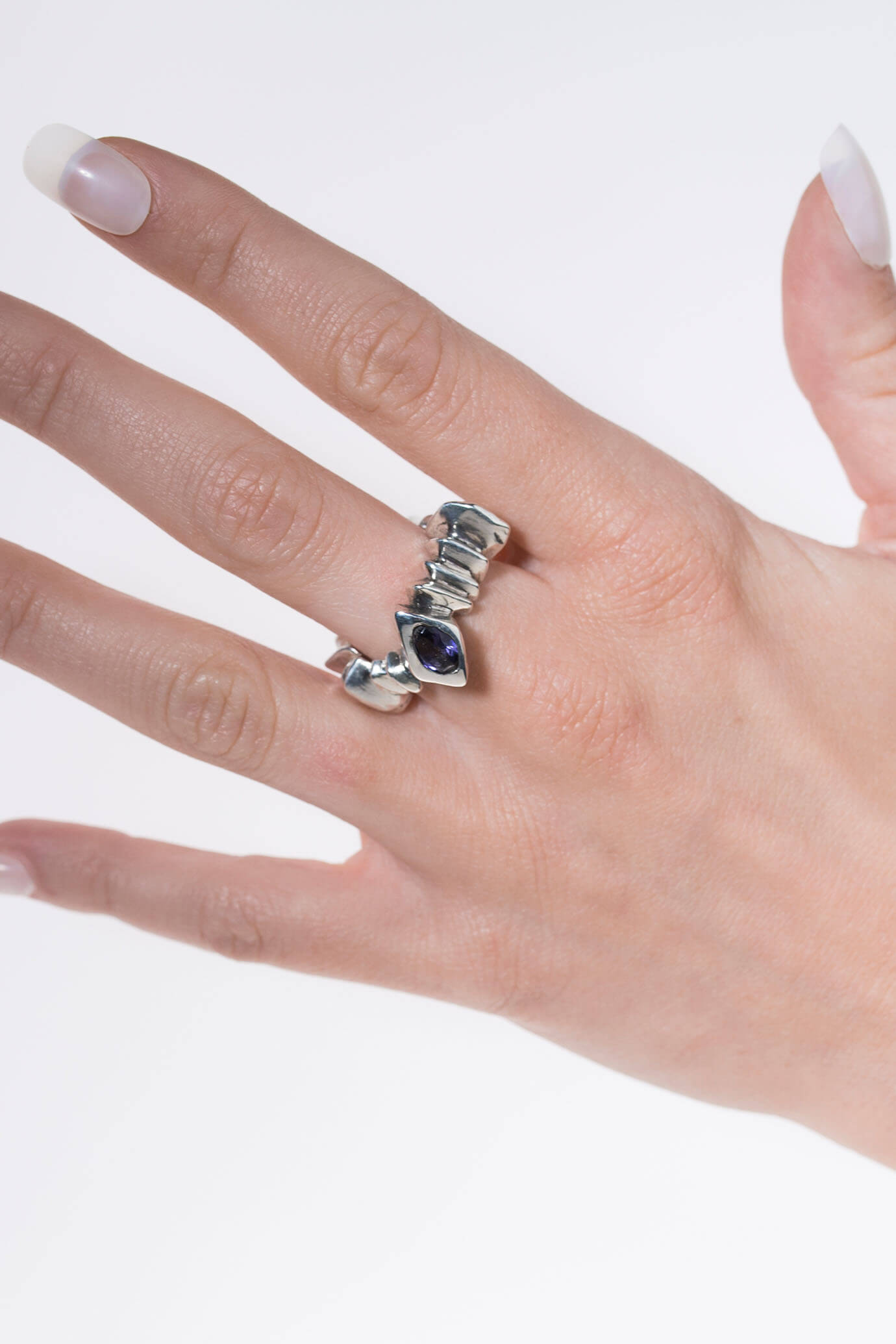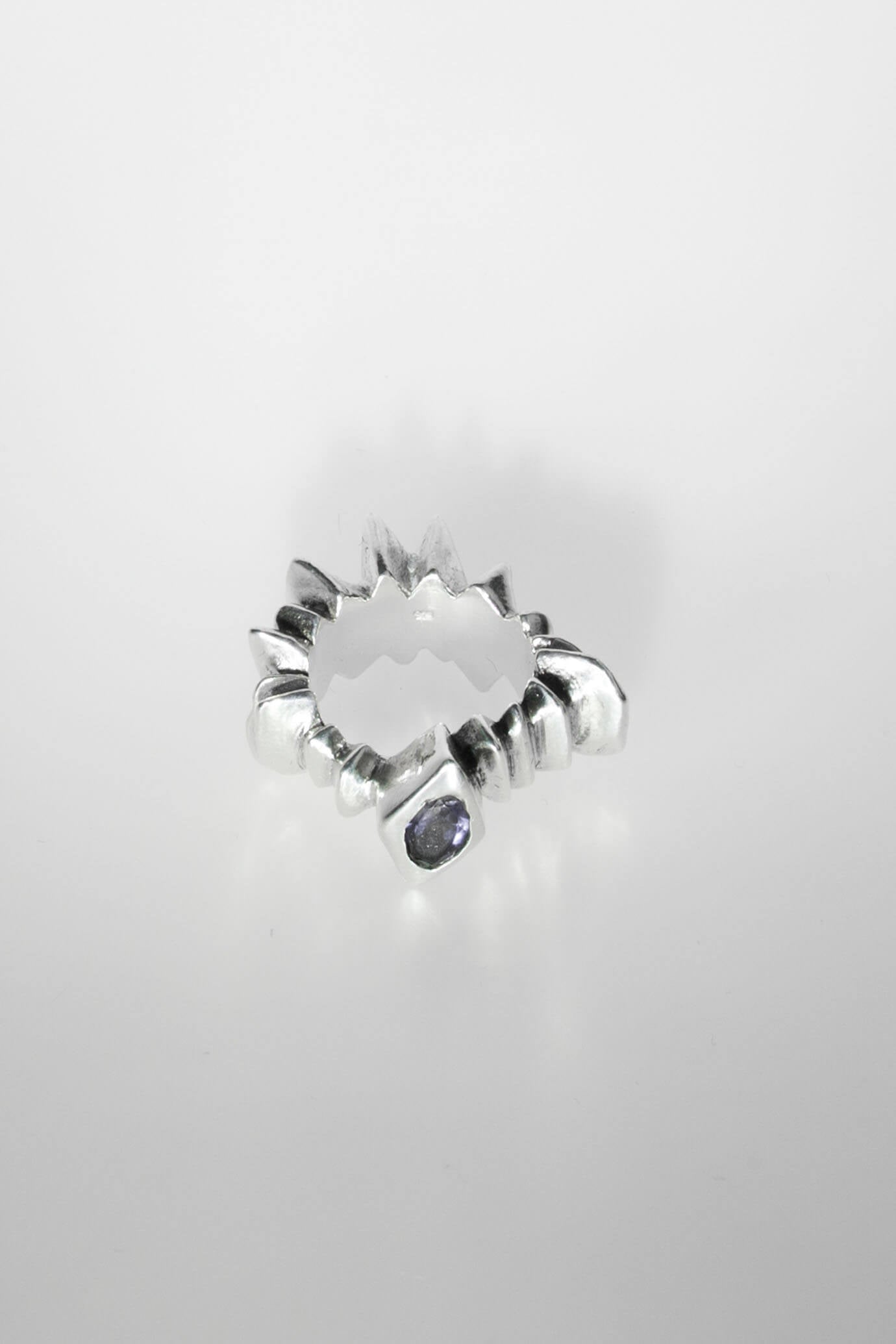 Contemporary Berlin-based jewellery label Myon Rox introduced this captivating world of sculptures. A guaranteed statement piece, crafted from 925 sterling silver, finished with Lolith stones. The edges may seem intimidating but the unique tactile sensation is reminding you of the ring's presence and giving you a sense of empowerment.