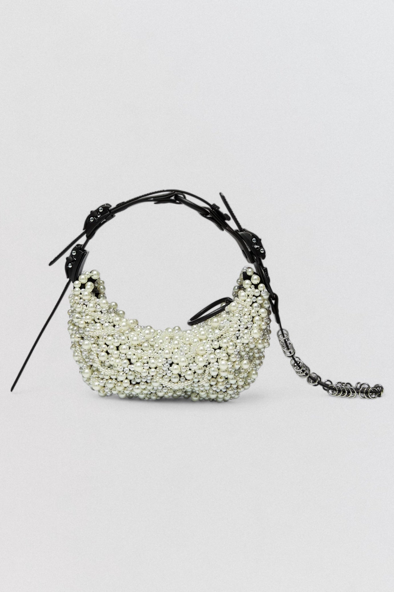 An audacious statement piece, the Junya Watanabe x Innerraum Half Moon Tote Bag redefines futuristic fashion with a punk-inspired edge. Embellished with ornate pearl detailing and bold metal spikes, this one-of-a-kind accessory merges high fashion with industrial aesthetics.