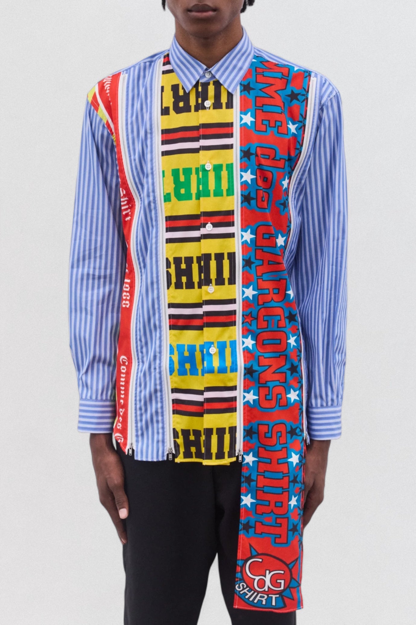 Bold, unconventional, and distinctly avant-garde, the Comme des Garçons SHIRT Zip Football Scarf Shirt redefines tailoring with a street-inspired twist. Part of the Comme des Garçons SHIRT Autumn/Winter 2025 collection, this piece fuses classic menswear with statement graphics. Crafted from premium cotton, it features a point collar, curved hem, patch pocket, and button placket while transforming the traditional shirt with football scarf motifs emblazoned across the front. Functional zip details throughout amplify the deconstructed aesthetic, adding movement and versatility. Finished with button cuffs for a refined touch, this shirt embodies Rei Kawakubo’s playful reinterpretation of wardrobe staples.